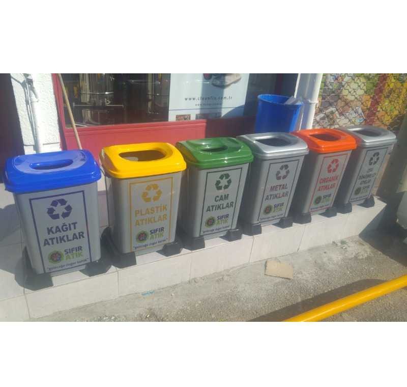 Çöp kovaları yan yana konularak sıfır atık geri dönüşüm çöp kovası seti oluşturabilir.