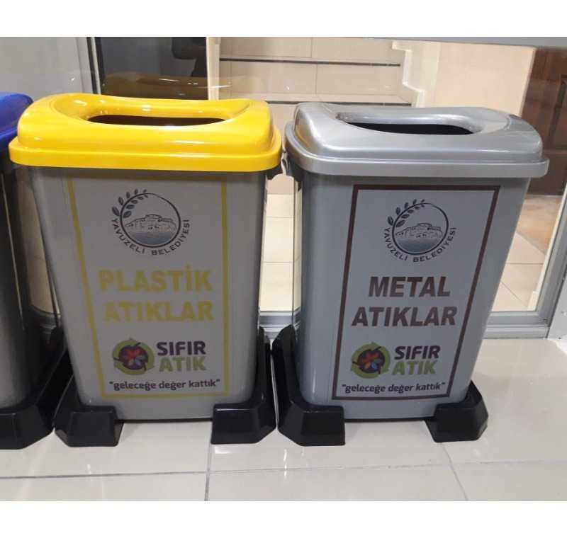 Çöp kovaları yan yana konularak sıfır atık geri dönüşüm çöp kovası seti oluşturabilir.