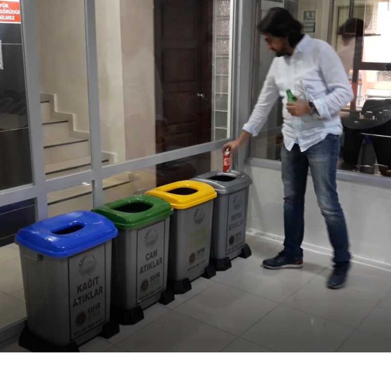 Çöp kovaları yan yana konularak sıfır atık geri dönüşüm çöp kovası seti oluşturabilir.