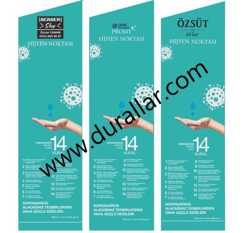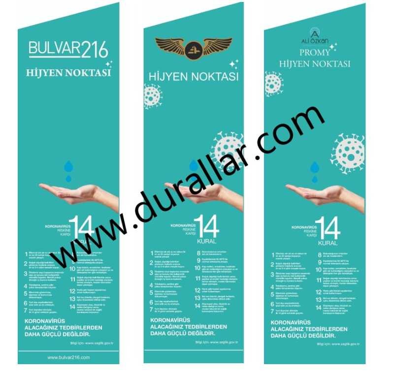 - Dezenfektan standı, 40x146 cm ölçüsünde 18 mm ahşap üzeri dijital baskı ile tasarlanmıştır.