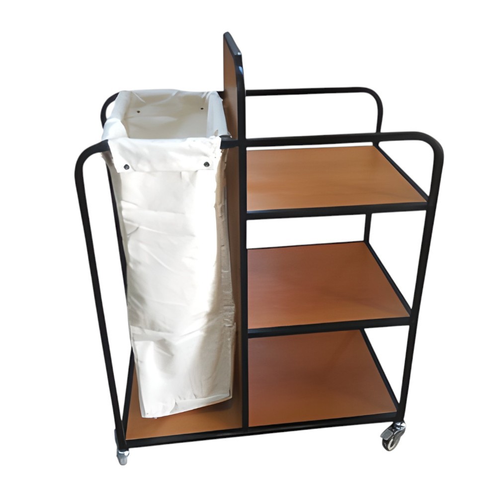 Ahşap Otel Arabası, otel, tatil köyü, yurt, hastane ve rezidanslarda housekeeper hizmetlerini kolaylaştıran dayanıklı ve şık bir çözümdür. Ahşap ve elektrostatik boyalı DKP profil iskelet yapısı ile uzun ömürlü kullanım sağlar.
