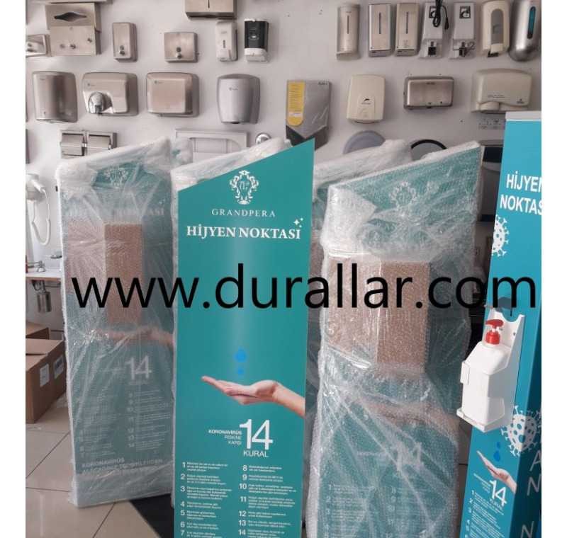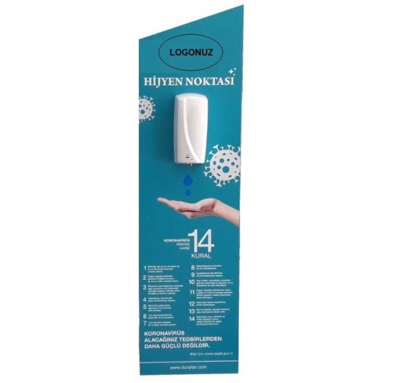 Ellerin dezenfekte edilmesi amacıyla kullanılan dezenfektan standı, üzerinde takılı bulunan dirsek kumandalı dezenfektan verici dispenser, işyerleri, ofisler, banka şubeleri, marketler, apartman ve siteler, belediyeler, kamu kuruluşları, benzin istasyonları, cafe ve restoranlar, okullar gibi toplu yaşam alanlarında çalışanların ve misafirlerinizin ellerini kolaylıkla dezenfekte edebilmesi için geliştirilmiş bir hijyen noktası standıdır.Hijyen noktası standına kurumunuzun ya da firmanızın logosu ile istediğiniz tasarım digital baskı olarak uygulanabilir.Böylelikle başta corona covid 19 virüsü ve diğer virüs ve bakterilerden sevdiklerinizi, müşterilerinizi ve çalışnalarınızı korurken aynı zamanda dezenfekte ve hijyen konusunda farkındalık yaratmış olursunuz.