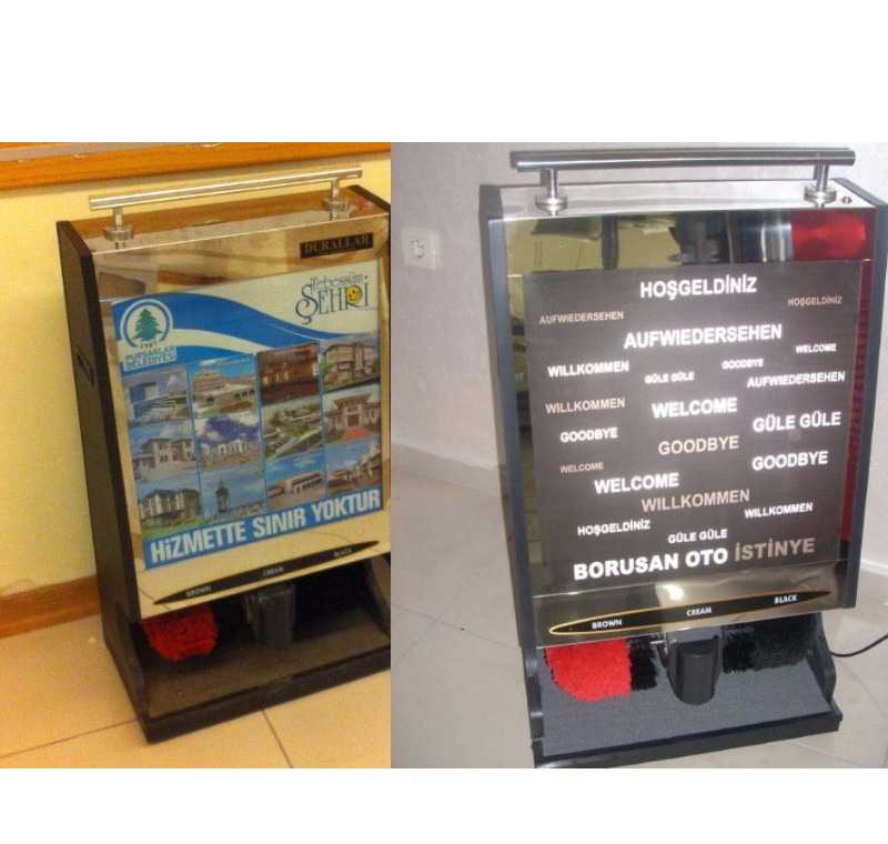 Otel tipi ayakkabı parlatma makinası : Otel, Polisevi, Orduevi, Konukevi, Misafirhane gibi mekanların girişinde kullanılır.