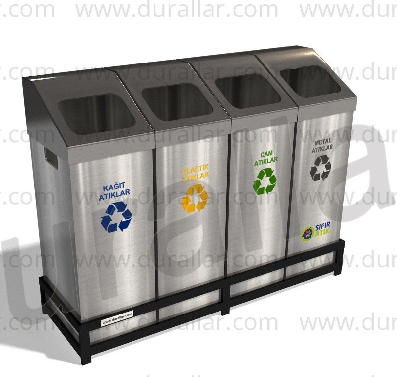 100 Litre kapasiteli 4 lü Geri Dönüşüm Atık Seti, elektrostatik boyalı DKP saç ve 430 kalite paslanmaz çelik ile üretilmiş dayanıklı sıfır atık kutusu 4 lü.