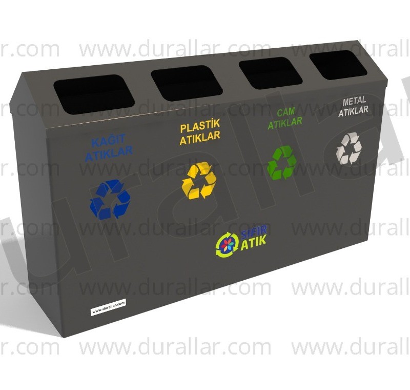 96 cm genişlikte, 200 Litre kapasiteli GDK-4075 4 lü Sıfır Atık Geri Dönüşüm Kutuları, elektrostatik boyalı DKP saç ile dayanıklı sıfır atık çöp kovaları.