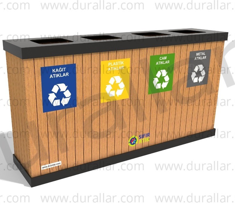 96 cm genişlikte, 200 Litre kapasiteli GDK-4075 4 lü Sıfır Atık Geri Dönüşüm Kutuları, elektrostatik boyalı DKP saç ile dayanıklı sıfır atık çöp kovaları.