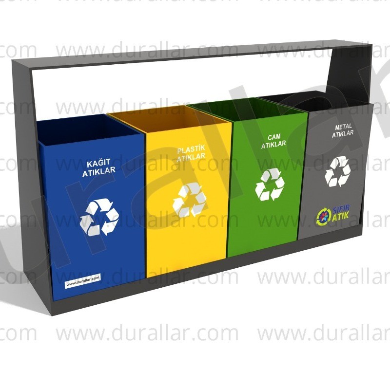 96 cm genişlikte, 200 Litre kapasiteli GDK-4075 4 lü Sıfır Atık Geri Dönüşüm Kutuları, elektrostatik boyalı DKP saç ile dayanıklı sıfır atık çöp kovaları.