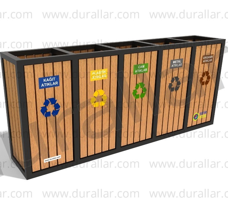 Estetik ve fonksiyonel tasarımlı GDK-5019 Sıfır Atık Kutusu, 300 L kapasitesi ve renk kodlu bölmeleriyle çevre dostu atık yönetimi sağlar. Kurumlar ve belediyeler için uygundur.