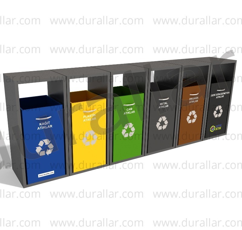 GDK-6077 6’lı Sıfır Atık Çöp Kutusu, 234 Litre kapasite ve elektrostatik boyalı DKP saç malzemesi ile dayanıklı, şık ve çevre dostu geri dönüşüm çözümüdür.