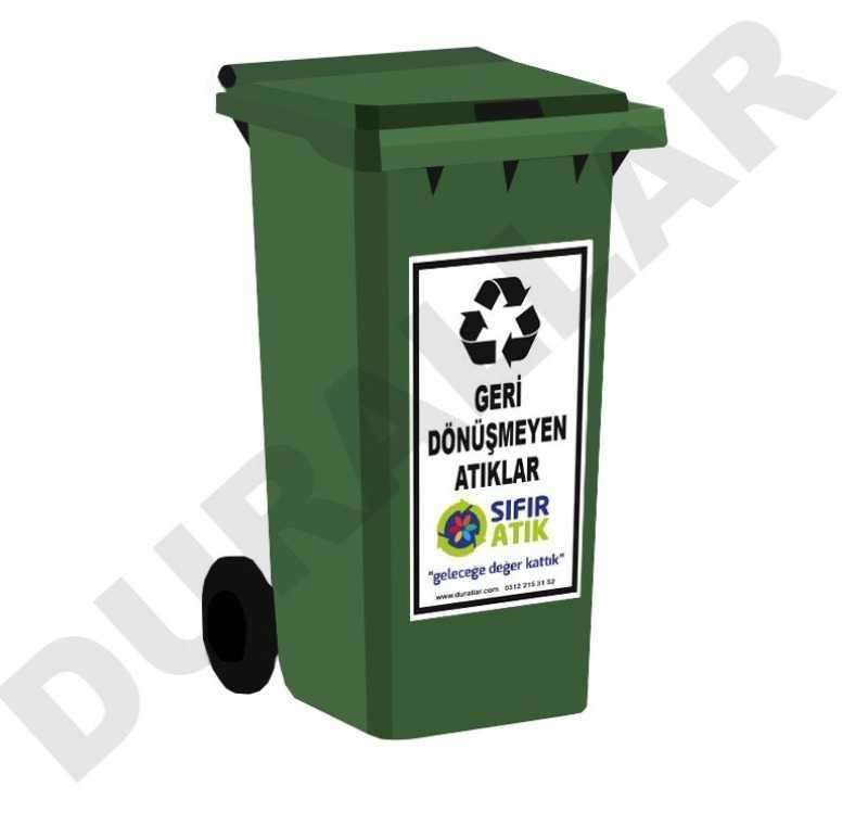 120 Litre geri dönüşmeyen atık konteyneri, sıfır atık projeleri kapsamında geri dönüşmeyen atıkların geçici olarak güvenli bir şekilde biriktirilmesi için tasarlanmıştır. Ürün, geri dönüşmeyen atık etiketli ve sıfır atık logolu olarak sunulmaktadır.