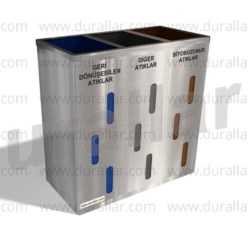 Gdk-3041 3’lü Geri Dönüşüm Sıfır Atık Kutusu ile atıkları kolayca ayrıştırın. 75 L kapasite, elektrostatik boyalı DKP saç kova ve kapak, 304 kalite paslanmaz çelik dış ünite ile dayanıklı ve çevre dostu çözüm.