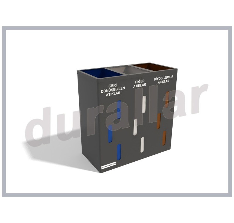 Gdk-3084 3’lü Sıfır Atık Geri Dönüşüm Kutusu, 162 Litre kapasite, 430 kalite paslanmaz çelik ile dayanıklı ve uzun ömürlü çevre dostu geri dönüşüm çözümü sunar.
