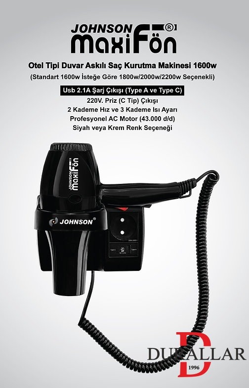 Jackson Maxifon 2575 Usb Otel Tipi Saç Kurutma Makinesi, otellerin banyolarında misafirlerin saçlarını güvenli ve konforlu bir şekilde kurutmaları için tasarlanmıştır. Duvara monte ve spiral kablolu tasarımı ile pratik kullanım sunar. 2 kademeli hız ve 3 kademeli ısı ayarı ile her misafirin ihtiyacına uygun kullanım sağlar. Ayrıca USB 2.1A şarj çıkışı (Type A ve Type C) ve 220V priz (C Tip) çıkışı ile misafirlerin telefon ve diğer cihazlarını şarj edebilmesine imkan tanır.
