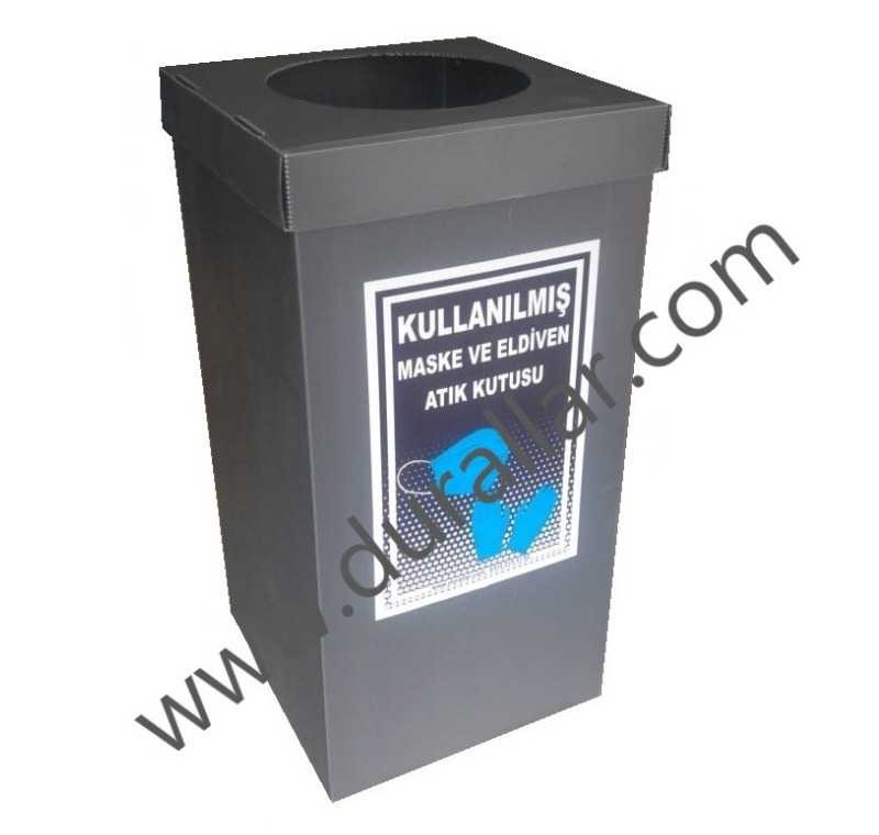 Atık çöp kovasının tek tarafında etiket ile ’’Kullanılmış Maske ve Elidven Atık Kutusu’’ ibaresi vardır.