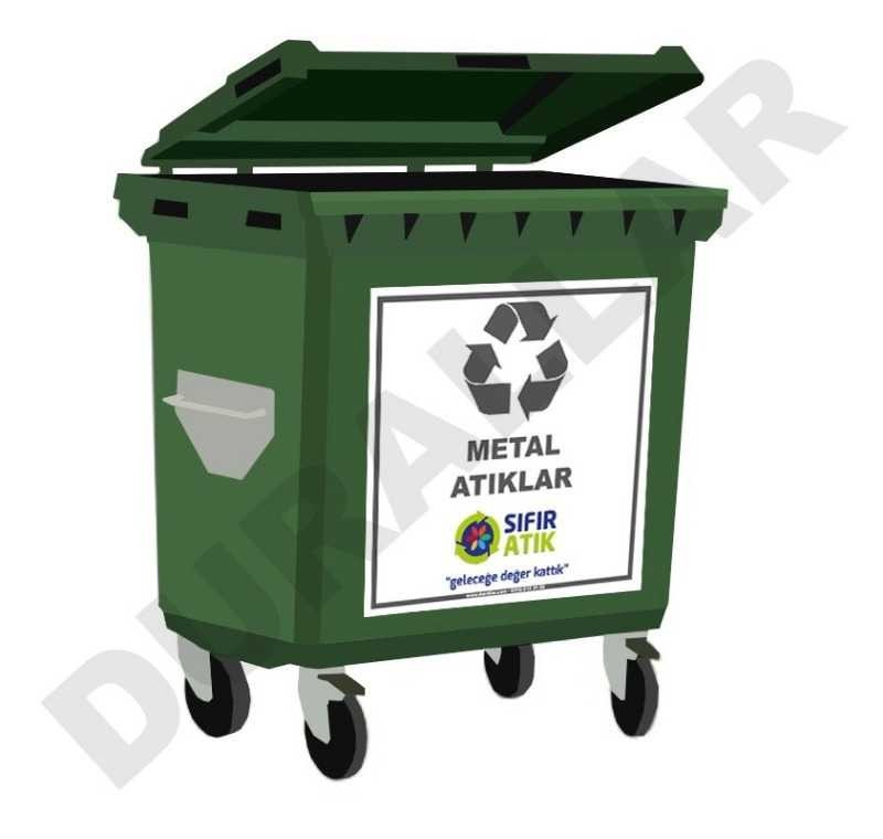 660 Litre metal atık konteyneri, sıfır atık projeleri kapsamında metal atıkların geçici olarak güvenli bir şekilde biriktirilmesi için idealdir. Ürün, metal atık etiketli ve sıfır atık logolu olarak sunulmaktadır.
