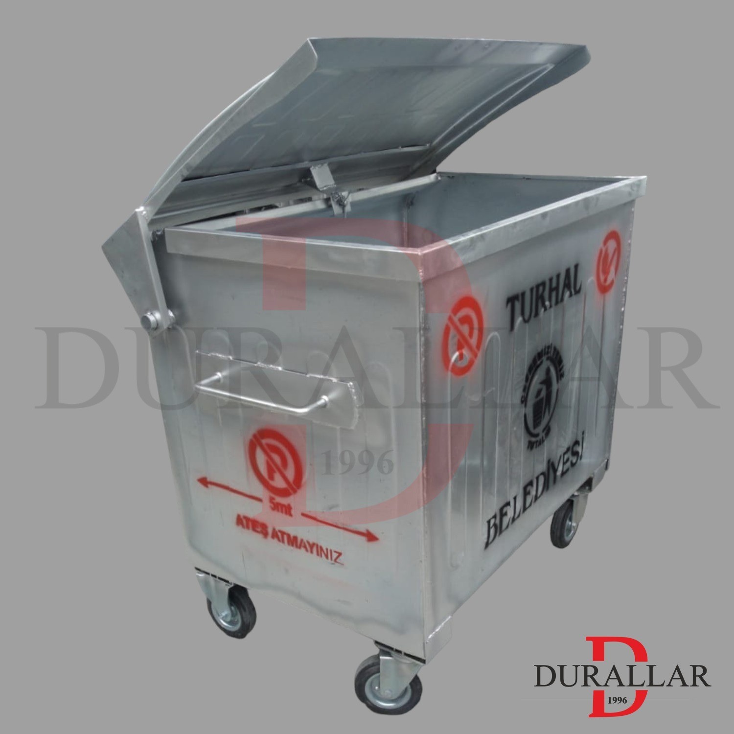 Galvaniz çöp konteyneri kaldırma kolları araç kaldırma sistemine uygun imal edilmiştir.