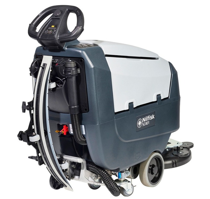 Nilfisk SC 401 B, sessiz ve etkili çalışma özellikleri, kolay bakım sistemi ve yüksek verimliliği ile dar ve yoğun alanlarda maksimum performans sağlayan akülü bir zemin temizleme çözümüdür.