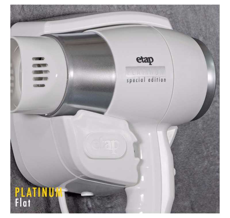 Otelinize gelen müşterilerinizi en yüksek seviyede memnun edecek bir ürün olan Platinium Flat model otel tipi saç kurutma makinası,duvarda compact görüntü sağlayan askı aparatı,gizli elektrik bağlantısına elverişli askı aparatı,standart duvara monte delik merkezleri ve sade tasarımı ile otelinize değer katacak otel tipi saç kurutma makinesidir.