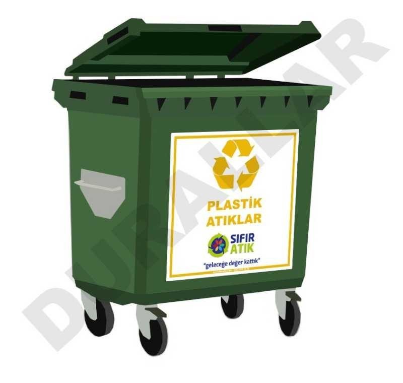 660 Litre plastik atık konteyneri, sıfır atık projeleri kapsamında plastik atıkların geçici olarak güvenli bir şekilde biriktirilmesi için idealdir. Ürün, plastik atık etiketli ve sıfır atık logolu olarak sunulmaktadır.