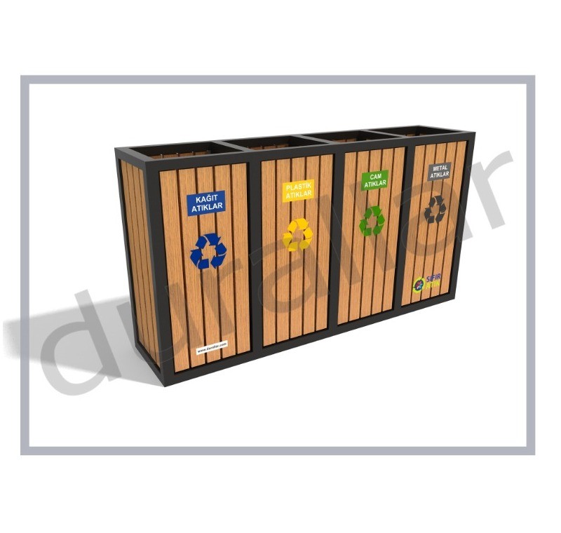 GDK-4080 Geri Dönüşüm Kutusu Büyük ve geri dönüşüm kutusu dış mekanda yere monte edilebilir yada seyyar şekilde imalati yapılır.Geri dönüşüm çöp kovasının ayakları yere çelik dübelle yada beton dökülerek monte edilebilir.Geri dönüşüm kovasının üzerinde sigara söndürmek için kapak opsiyonları bulunmaktadır.Geri dönüşüm kutusu genel ebatları olarak insanların isteyine göre imal edilir.Geri dönüşüm atık kovasının imalati sac,çelik,demir,galvaniz,paslanmaz,krom,ahşap olarak üretlir.Geri dönüşüm setinın iç kovaları 0,8 mm DKP sacdan üretilir.Metal geri dönüşüm kutusu tamamen 304 kalite paslanmaz çelikten üretilebilir.Ahşap geri dönüşüm kutusunun ahsapları 1.sınıf emprenyeli çam ağacı kullanılarak üretilebilir.Geri dönüşüm ünitesinin çöp hazneleri hareketli olanların içinde bulunan çöpler kolayca alınabilir.Geri dönüşüm kovası kova rengi ve ayak renkleri farklı olacak renkler insanlarin isteyine göre yapılır.Geri dönüşüm kutusu boyama şekli 200 derece de fırınlanan elektrostatik toz boyama sistemi ile boyanır.Atık kovasının kovaların ön ve arka yüüne Geri dönüşüm logosu ve uygun görülecek yazılar yazılabılır