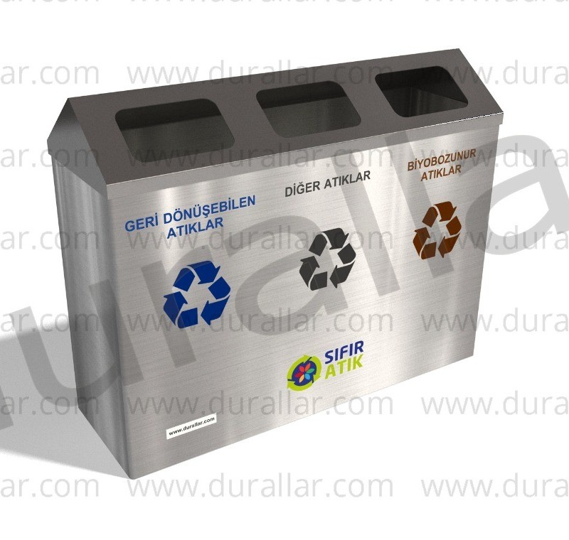 Gdk-3084 3’lü Sıfır Atık Geri Dönüşüm Kutusu, 162 Litre kapasite, 430 kalite paslanmaz çelik ile dayanıklı ve uzun ömürlü çevre dostu geri dönüşüm çözümü sunar.