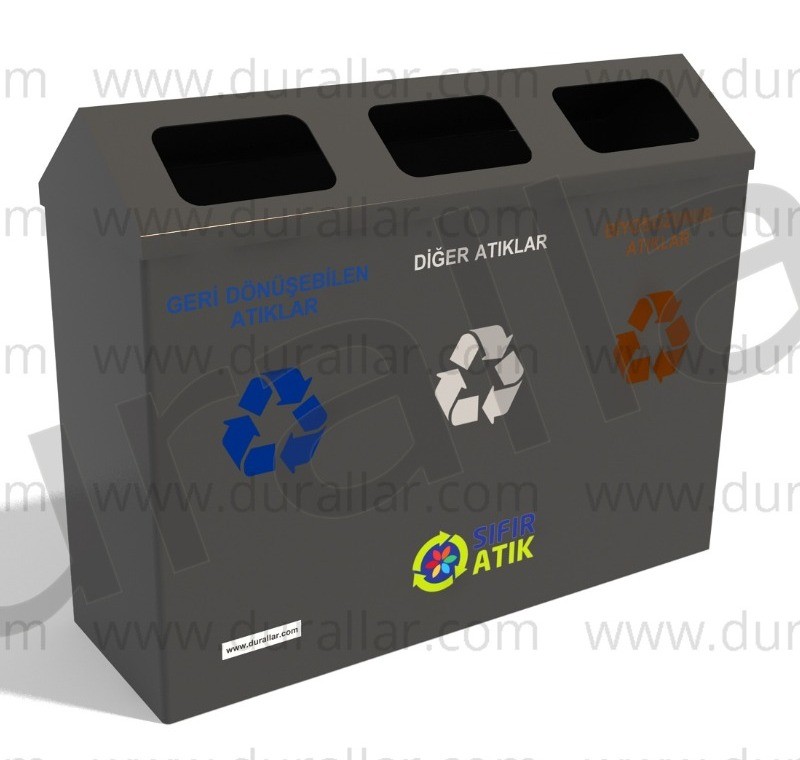 Gdk-3089 3’lü sıfır atık geri dönüşüm kutusu, 162 Litre kapasitesi ve dayanıklı elektrostatik boyalı DKP saç malzemesi ile çevre dostu geri dönüşüm çözümü sunar.