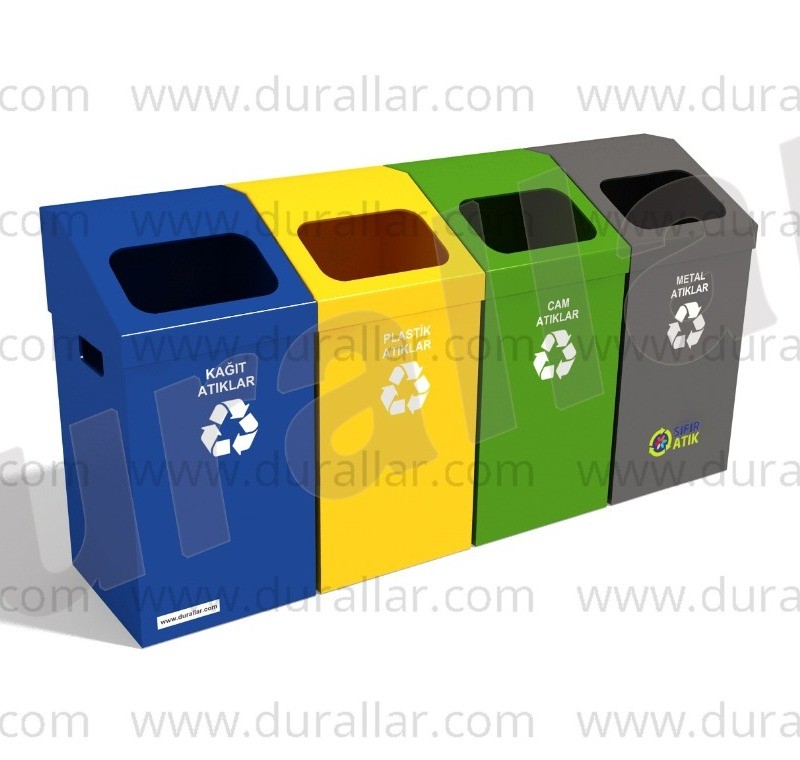 96 cm genişlikte, 200 Litre kapasiteli GDK-4075 4 lü Sıfır Atık Geri Dönüşüm Kutuları, elektrostatik boyalı DKP saç ile dayanıklı sıfır atık çöp kovaları.