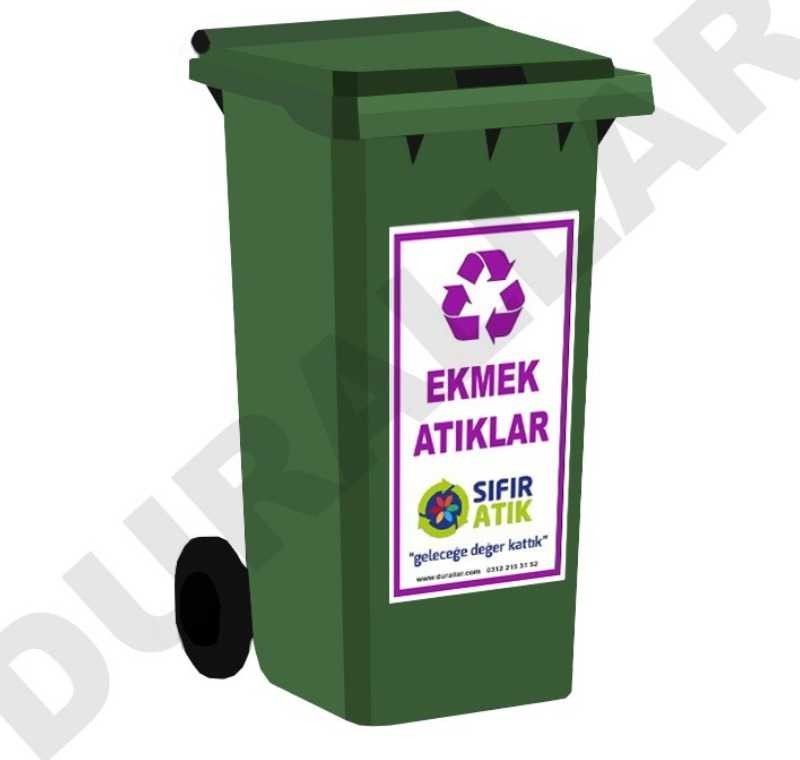 240 Litre ekmek atıkları konteyneri, sıfır atık projeleri kapsamında ekmek atıklarının geçici olarak güvenli bir şekilde biriktirilmesi için tasarlanmıştır. Ürün, ekmek atıkları etiketli ve sıfır atık logolu olarak sunulmaktadır.