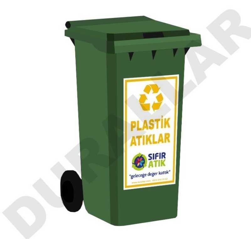 240 Litre plastik atık konteyneri, sıfır atık projeleri kapsamında plastik atıkların geçici olarak güvenli bir şekilde biriktirilmesi için tasarlanmıştır. Ürün, plastik atık etiketli ve sıfır atık logolu olarak sunulmaktadır.
