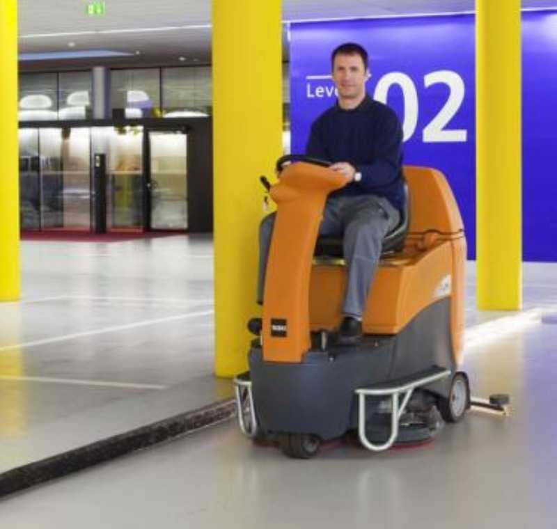 Clean 11001 binicili zemin temizleme otomatı, 4.180 m²/saat kapasite ile depolar, fabrikalar ve AVM’lerde epoksi, beton ve mermer zeminleri hızlı temizler.