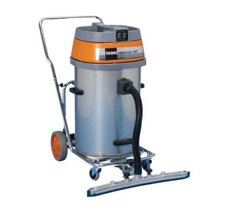 Taski Vacumat 44 T Çift Motorlu Islak Kuru Elektrik Süpürgesi, 2x950 W motor gücü, 44 litre ıslak-kuru tank kapasitesi ve ergonomik tasarımıyla orta ve büyük alanlarda hızlı, verimli ve dayanıklı temizlik sağlar.