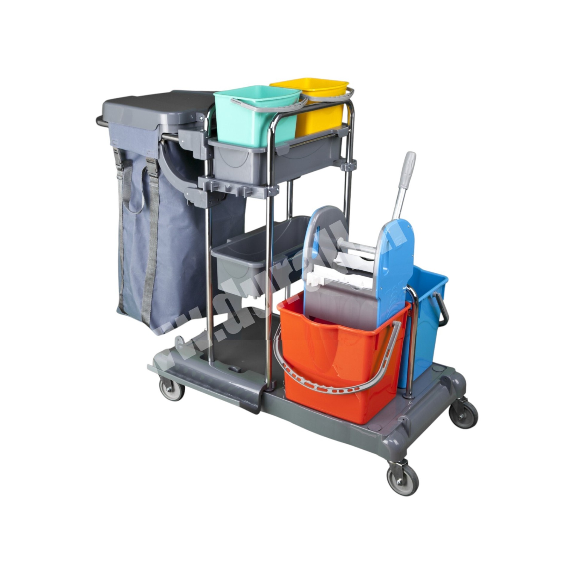 Temizlik arabası en uygun fiyatlarla! MTA-441 temizlik arabası, otel, hastane ve AVM’ler için üretilmiş çift kovalı, çöp bölmeli ve hijyenik temizlik kat arabasıdır.
